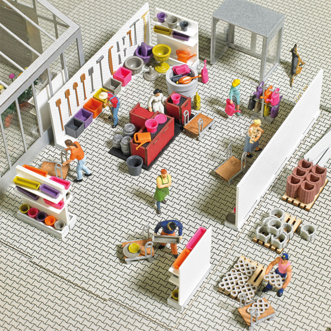 In diesem reichhaltig ausgestatteten Set ist alles enthalten, was in einem richtigen Gartencenter vorzufinden ist: Verschiedene Warenträger, Einkaufswagen, Paletten, Blumentöpfe und -kästen, Untersetzer, Pflanzkübel in verschiedenen Größen und Formen, Gießkannen, Gartenwerkzeug, Säcke für Blumenerde und Rindenmulch, Rasengittersteine, Bodenplatten und Rasenkanten.