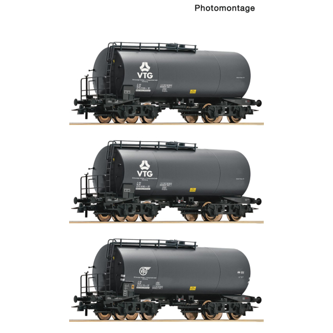 Wagenset mit drei 4-achsigen Kessel Wagen der VTG eingestellt bei den Deutschen Bundesbahn. ■ Alle Wagen mit unterschiedlicher Bedruckung